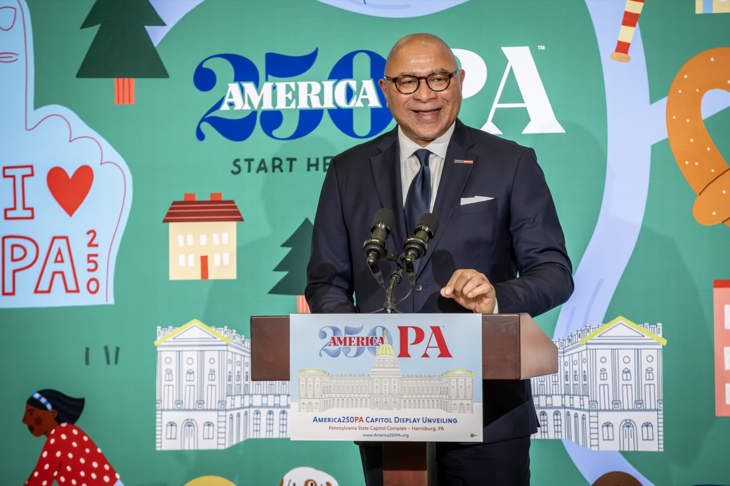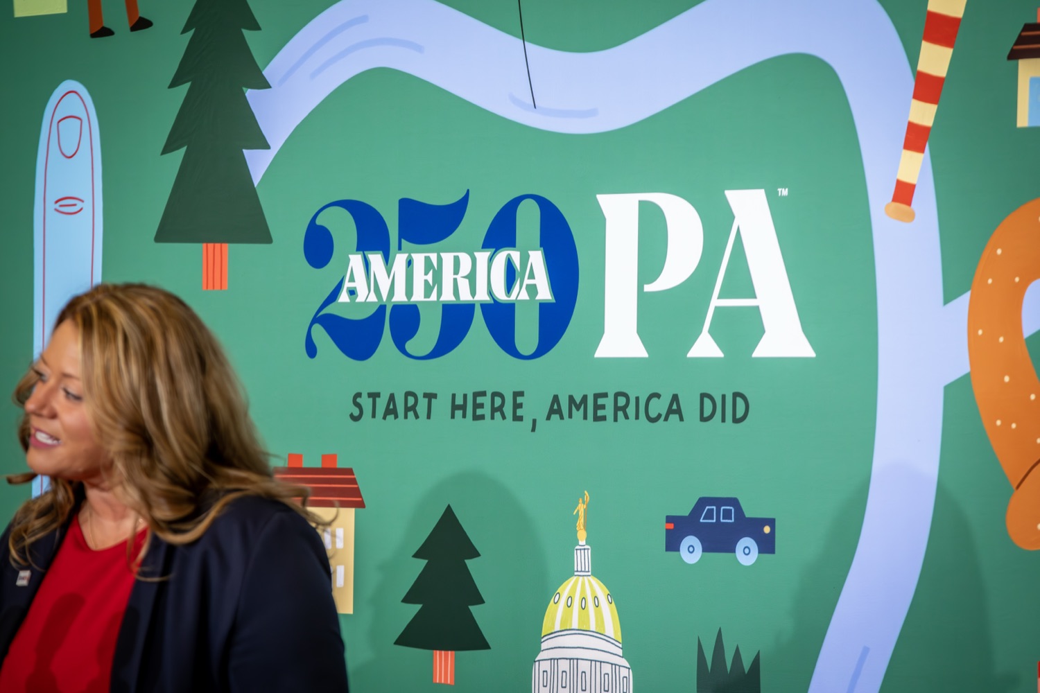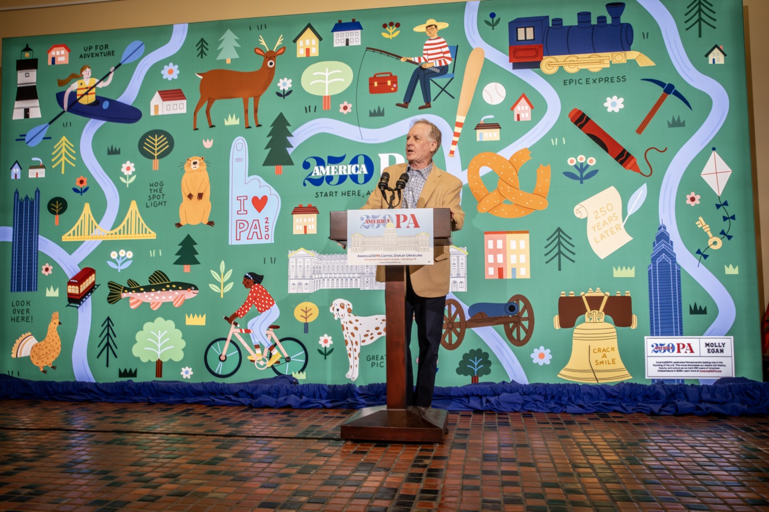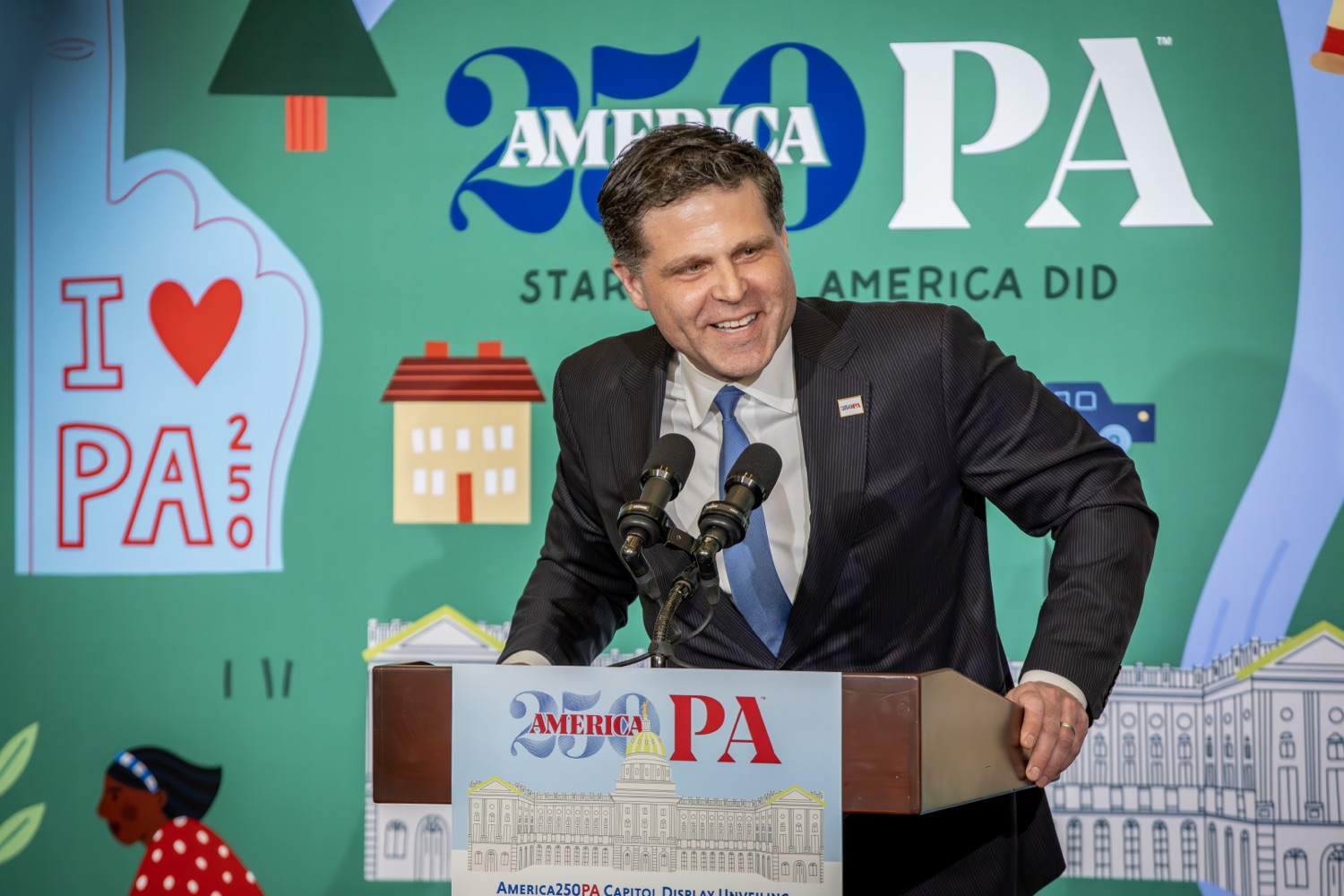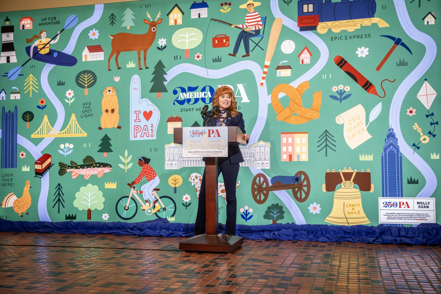America250PA, in collaboration with the Pennsylvania Department of Community and Economic Development (DCED) and the Pennsylvania Department of General Services (DGS), proudly unveiled a new, large-scale installation at thePennsylvania State Capitol.Designed by Philadelphia-based illustrator Molly Egan, the 12x20-foot illuminated display celebrates Pennsylvania's deep historical roots, diverse culture, and continued influence in shaping the nation. The installation showcases iconic imagery that reflects the Commonwealth's identity and lasting impact on American history, serving as an engaging focal point for visitors to the Capitol."It's hard to believe we started this journey seven years ago. Now, here we are in Harrisburg,surrounded by friends from across the Commonwealth, unveiling this beautiful display," said America250PA Chairman Patrick Burns. "Seeing it come together gives me great confidence in what our team at America250PA-and our partners in all 67 counties-will accomplish between now and the end of 2026."List of Speakers:America250PA Chairman Patrick BurnsAmerica250PA Executive Director Cassandra ColemanFormer Governor Mark SchweikerPADCED Deputy Secretary of Tourism Anne RyanPAAuditor General Tim DeFoorPAState Treasurer Stacy GarritySenator Greg RothmanRepresentative Jared SolomonRepresentative Valerie Gaydos