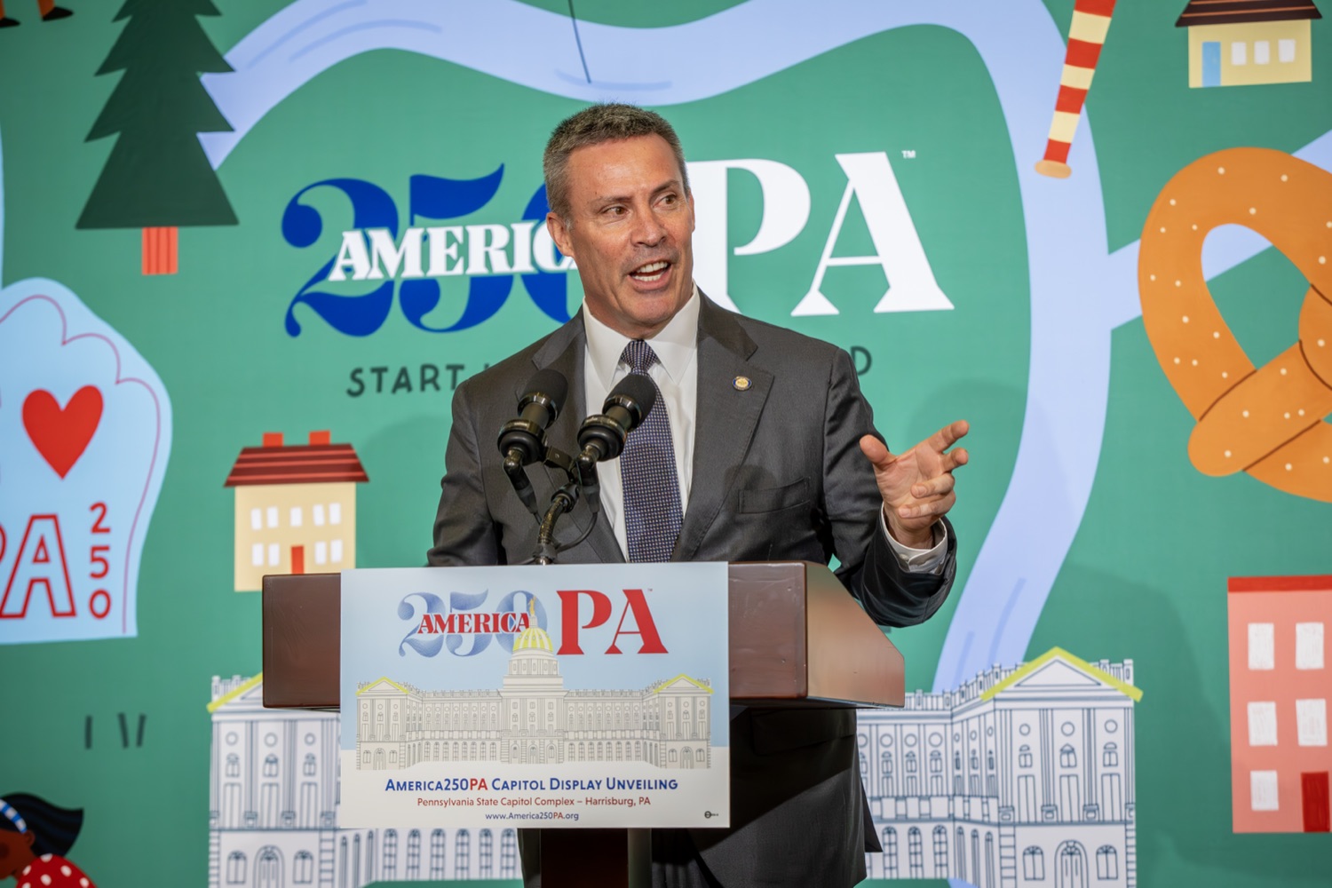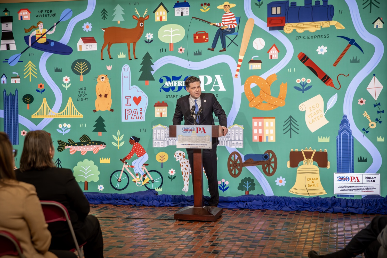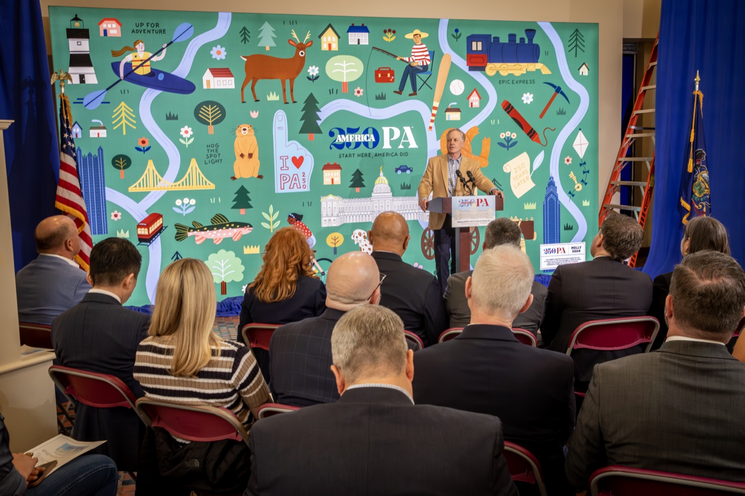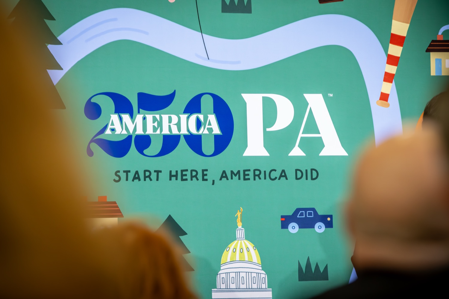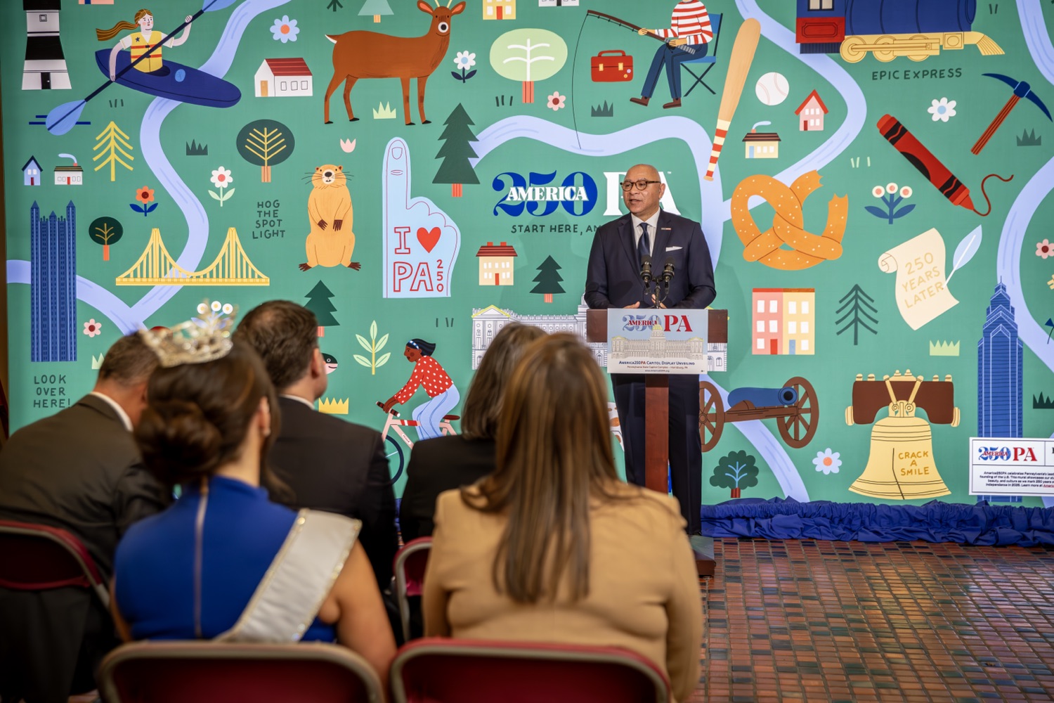 America250PA, in collaboration with the Pennsylvania Department of Community and Economic Development (DCED) and the Pennsylvania Department of General Services (DGS), proudly unveiled a new, large-scale installation at thePennsylvania State Capitol.Designed by Philadelphia-based illustrator Molly Egan, the 12x20-foot illuminated display celebrates Pennsylvania's deep historical roots, diverse culture, and continued influence in shaping the nation. The installation showcases iconic imagery that reflects the Commonwealth's identity and lasting impact on American history, serving as an engaging focal point for visitors to the Capitol."It's hard to believe we started this journey seven years ago. Now, here we are in Harrisburg,surrounded by friends from across the Commonwealth, unveiling this beautiful display," said America250PA Chairman Patrick Burns. "Seeing it come together gives me great confidence in what our team at America250PA-and our partners in all 67 counties-will accomplish between now and the end of 2026."List of Speakers:America250PA Chairman Patrick BurnsAmerica250PA Executive Director Cassandra ColemanFormer Governor Mark SchweikerPADCED Deputy Secretary of Tourism Anne RyanPAAuditor General Tim DeFoorPAState Treasurer Stacy GarritySenator Greg RothmanRepresentative Jared SolomonRepresentative Valerie Gaydos