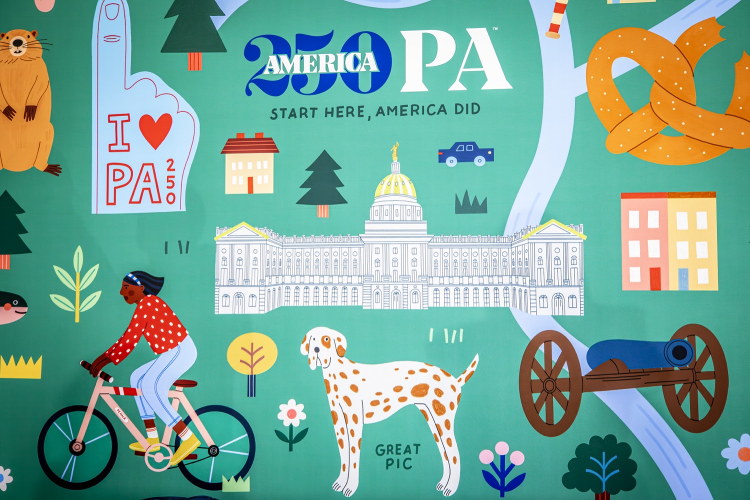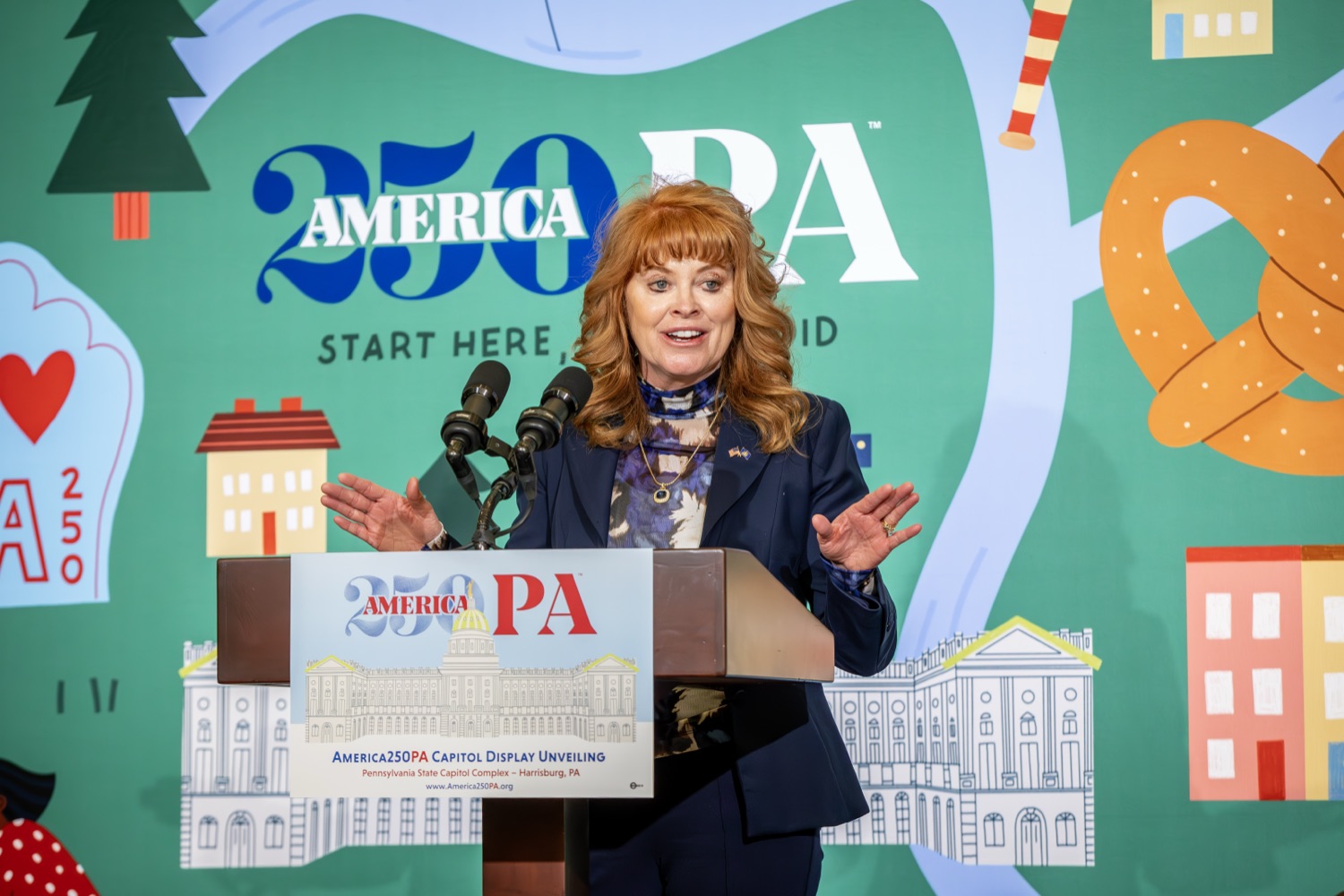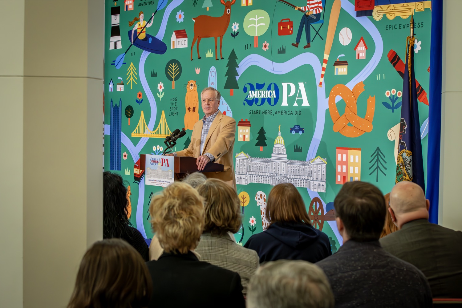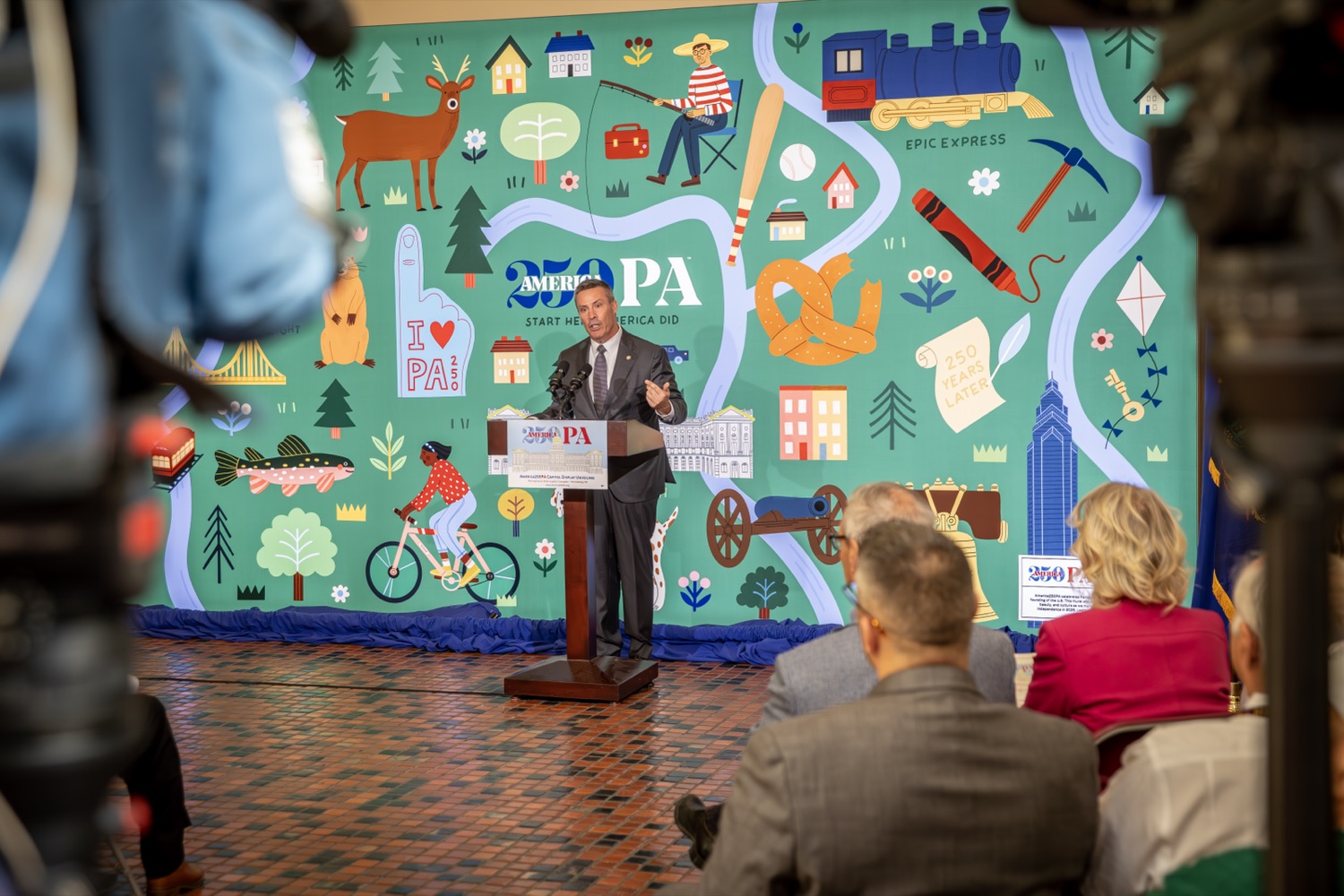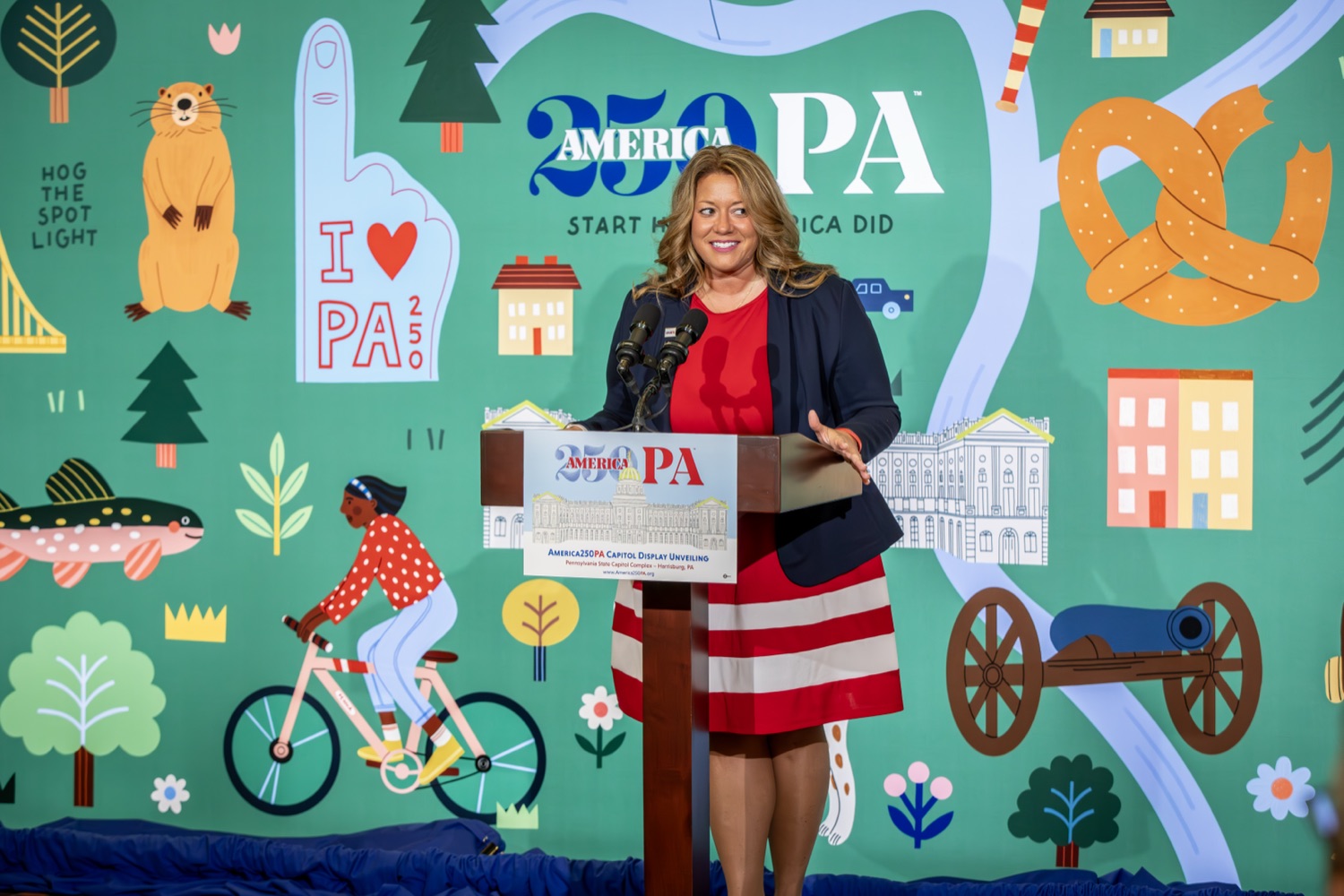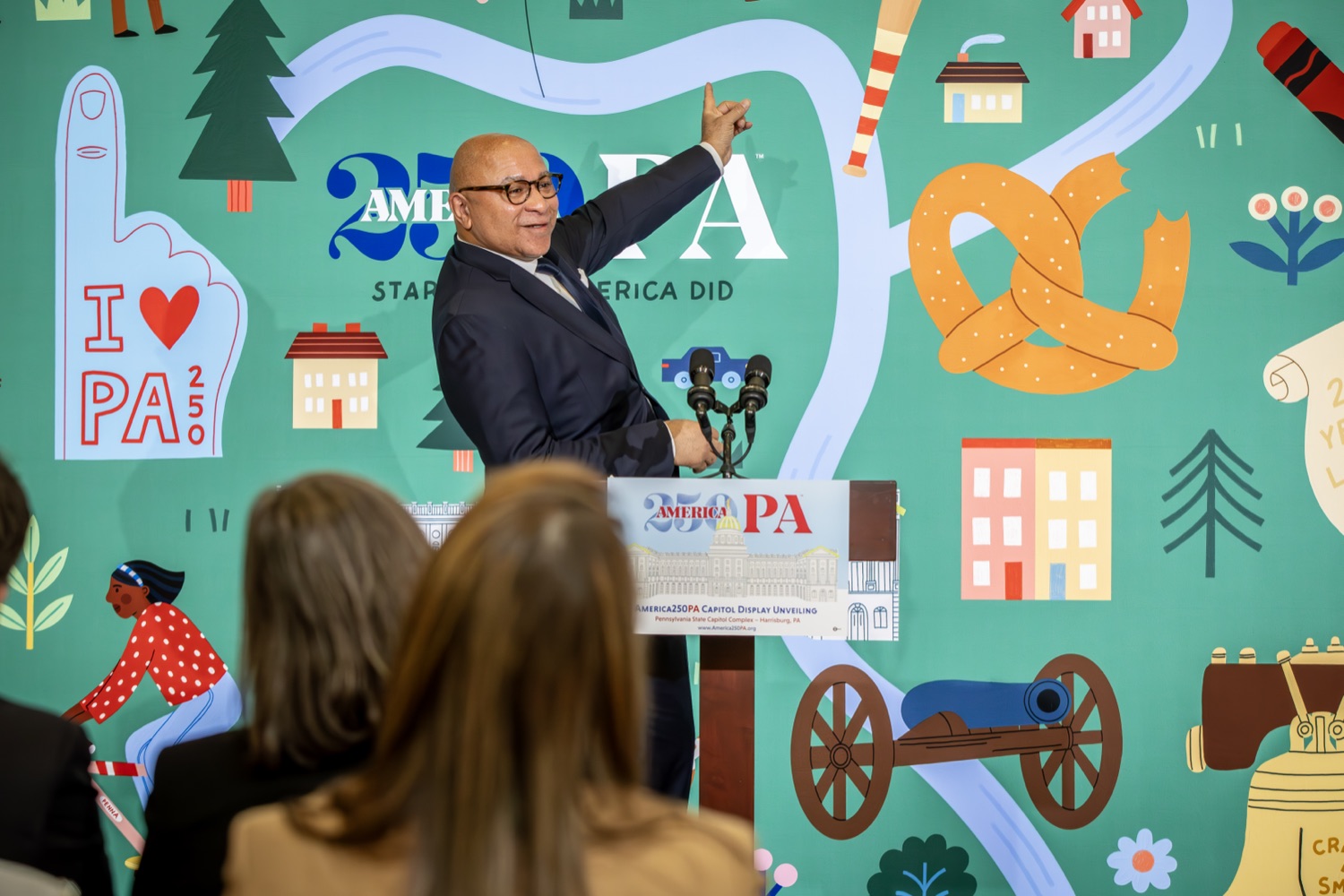 America250PA, in collaboration with the Pennsylvania Department of Community and Economic Development (DCED) and the Pennsylvania Department of General Services (DGS), proudly unveiled a new, large-scale installation at thePennsylvania State Capitol.Designed by Philadelphia-based illustrator Molly Egan, the 12x20-foot illuminated display celebrates Pennsylvania's deep historical roots, diverse culture, and continued influence in shaping the nation. The installation showcases iconic imagery that reflects the Commonwealth's identity and lasting impact on American history, serving as an engaging focal point for visitors to the Capitol."It's hard to believe we started this journey seven years ago. Now, here we are in Harrisburg,surrounded by friends from across the Commonwealth, unveiling this beautiful display," said America250PA Chairman Patrick Burns. "Seeing it come together gives me great confidence in what our team at America250PA-and our partners in all 67 counties-will accomplish between now and the end of 2026."List of Speakers:America250PA Chairman Patrick BurnsAmerica250PA Executive Director Cassandra ColemanFormer Governor Mark SchweikerPADCED Deputy Secretary of Tourism Anne RyanPAAuditor General Tim DeFoorPAState Treasurer Stacy GarritySenator Greg RothmanRepresentative Jared SolomonRepresentative Valerie Gaydos