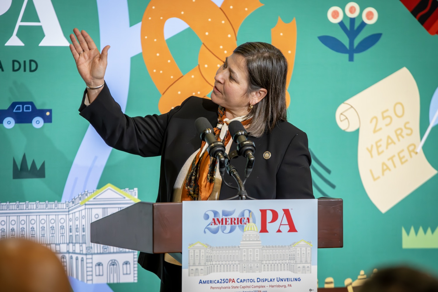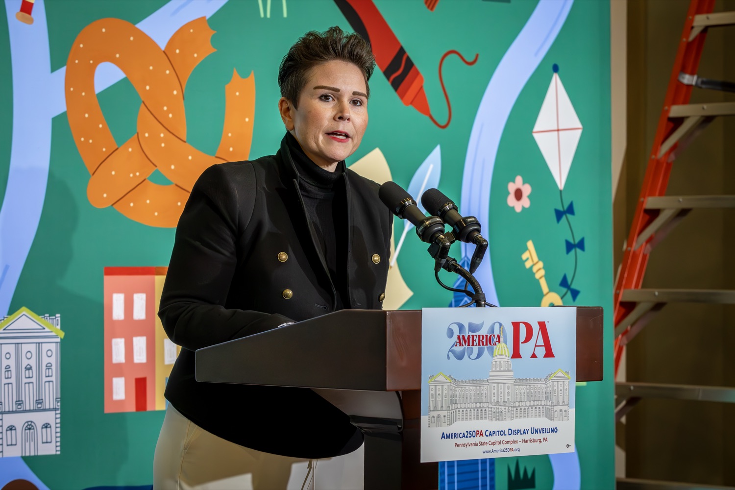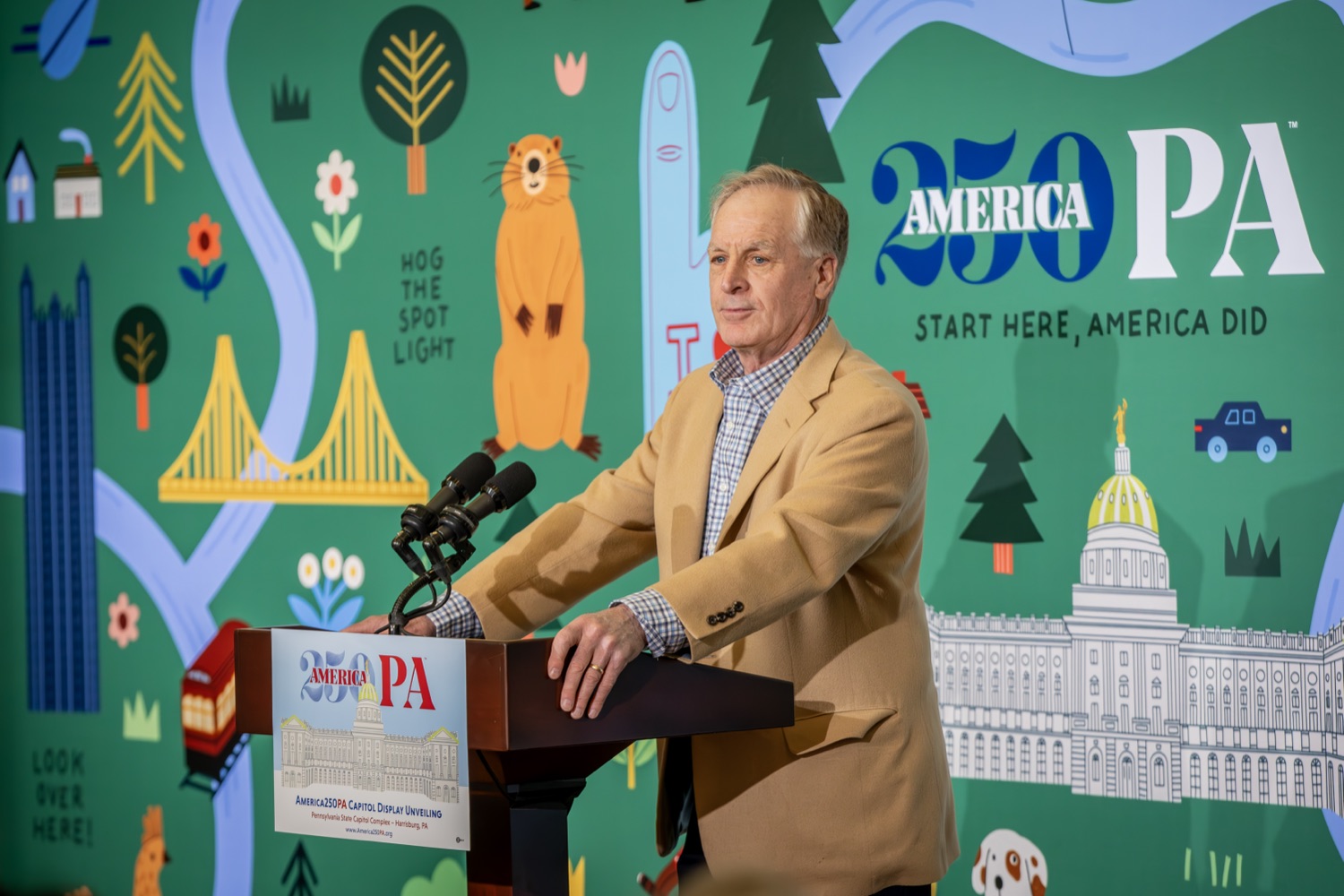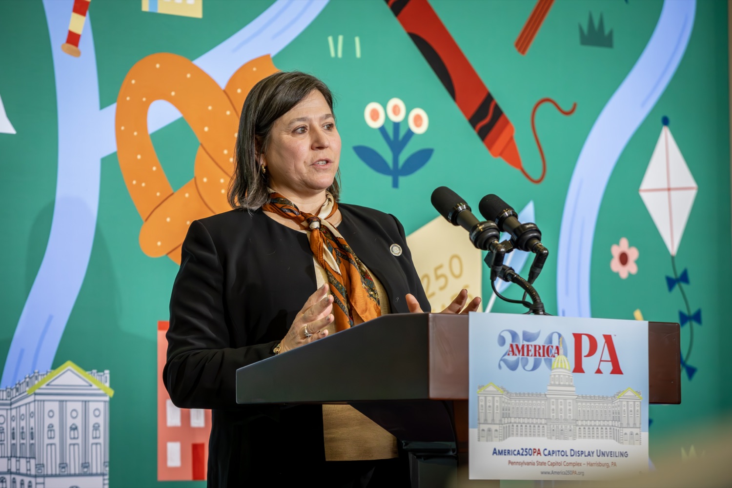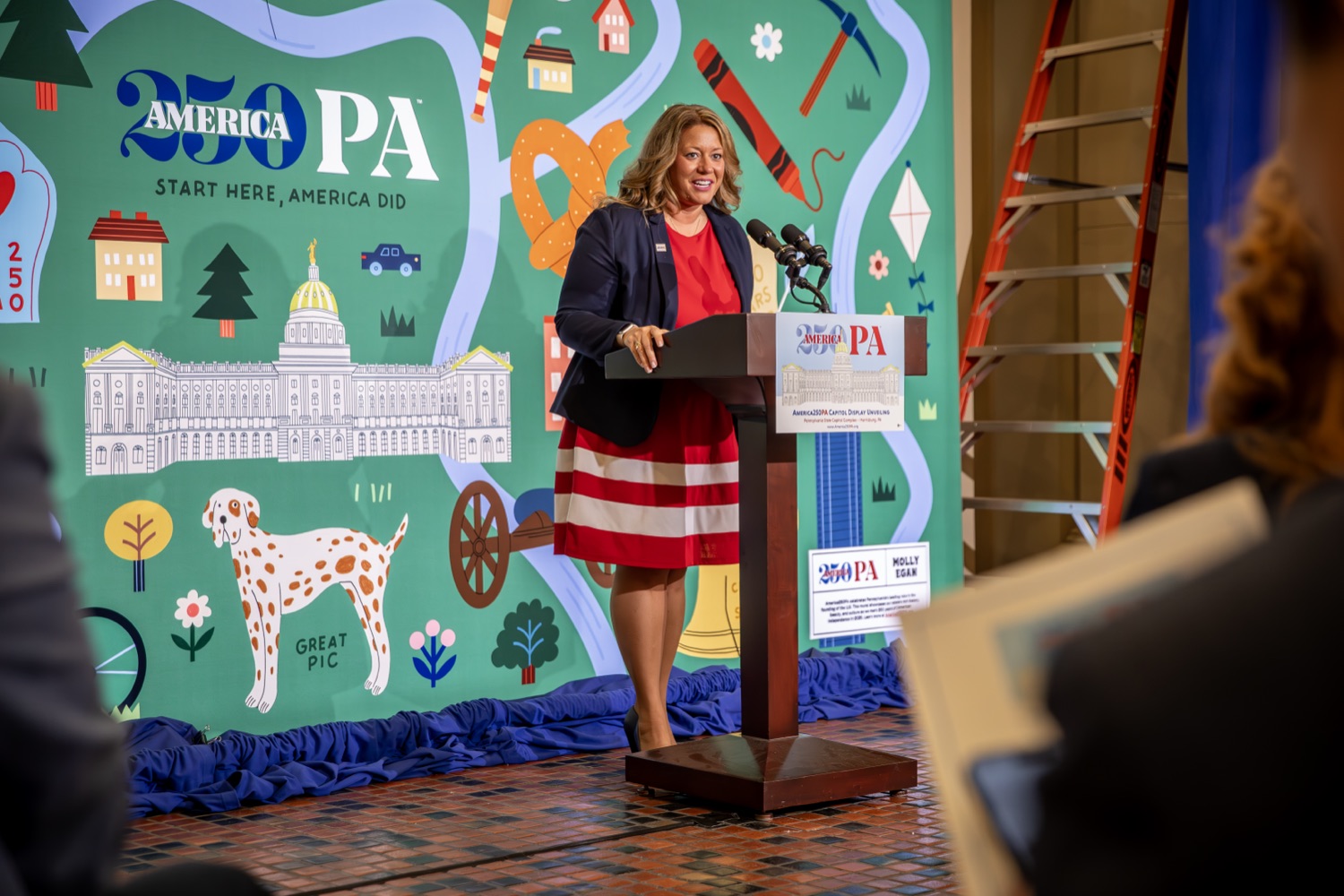 America250PA, in collaboration with the Pennsylvania Department of Community and Economic Development (DCED) and the Pennsylvania Department of General Services (DGS), proudly unveiled a new, large-scale installation at thePennsylvania State Capitol.Designed by Philadelphia-based illustrator Molly Egan, the 12x20-foot illuminated display celebrates Pennsylvania's deep historical roots, diverse culture, and continued influence in shaping the nation. The installation showcases iconic imagery that reflects the Commonwealth's identity and lasting impact on American history, serving as an engaging focal point for visitors to the Capitol."It's hard to believe we started this journey seven years ago. Now, here we are in Harrisburg,surrounded by friends from across the Commonwealth, unveiling this beautiful display," said America250PA Chairman Patrick Burns. "Seeing it come together gives me great confidence in what our team at America250PA-and our partners in all 67 counties-will accomplish between now and the end of 2026."List of Speakers:America250PA Chairman Patrick BurnsAmerica250PA Executive Director Cassandra ColemanFormer Governor Mark SchweikerPADCED Deputy Secretary of Tourism Anne RyanPAAuditor General Tim DeFoorPAState Treasurer Stacy GarritySenator Greg RothmanRepresentative Jared SolomonRepresentative Valerie Gaydos