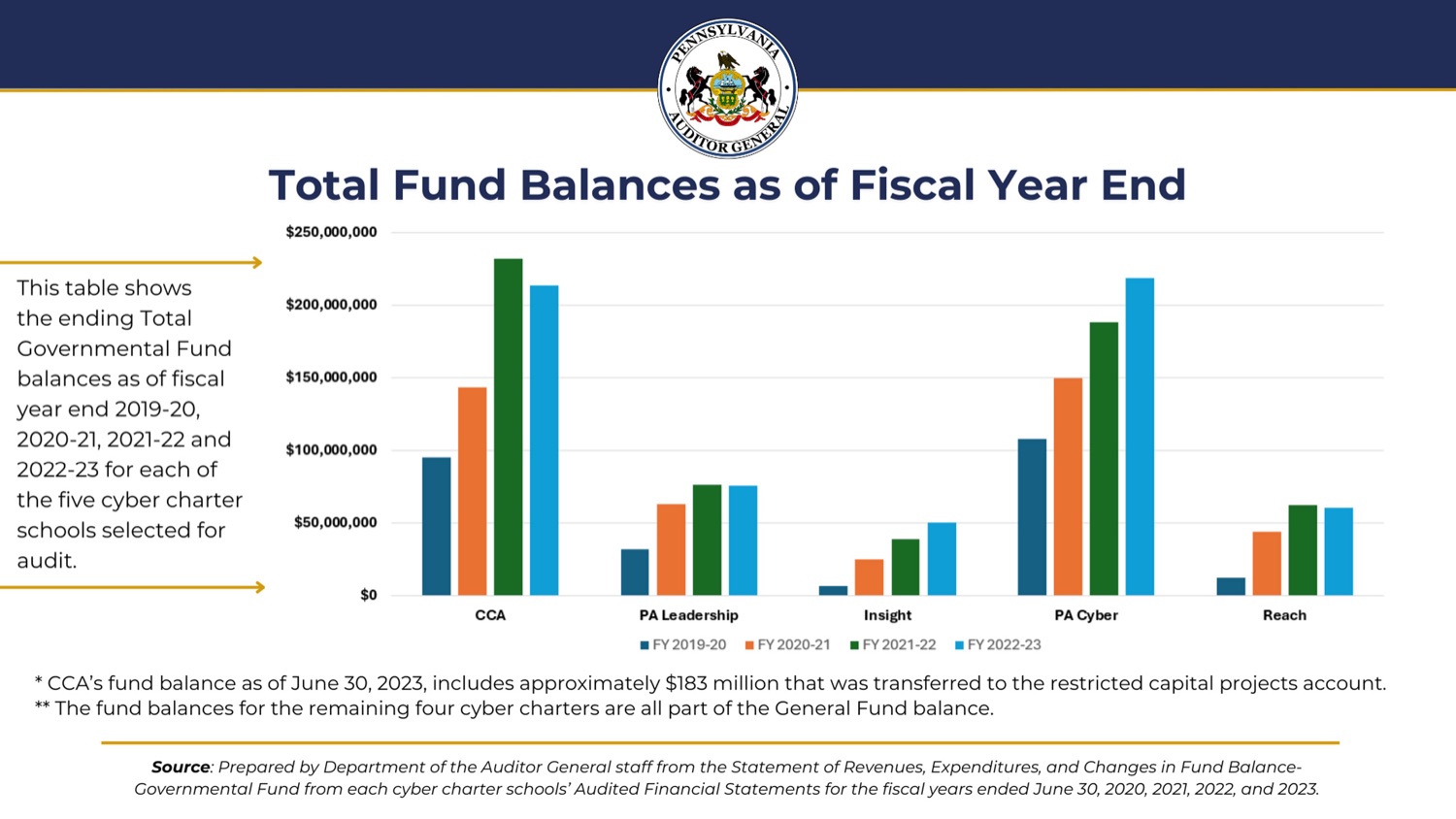 Auditor General Timothy L. DeFoor today released a performance audit of five cyber charter schools which shows from 2020 to 2023, they legally increased revenues by $425 million and reserves by 144%, due in part to an outdated funding formula that does not use actual instruction costs to determine tuition, set guidelines for spending or set limits for cyber charter school reserve funds."I am now the third auditor general to look at this issue and the third to come to the same conclusion: the cyber charter funding formula needs to change to reflect what is actually being spent to educate students and set reasonable limits to the amount of money these schools can keep in reserve," Auditor General DeFoor said. "Our recommendation is that in the next six months the Governor should appoint a task force to review the funding formula and direct it to issue a report within nine months determining a new formula that is equitable, reasonable and sustainable, and the General Assembly should act within six months of the taskforce's report to facilitate the enactment of legislation. The most important thing we can do is to provide our children with a quality education and as leaders we need to set our personal agendas aside and fix how we fund education in this state."Speaker list:Auditor General Timothy DeFoorGordon Denlinger, Deputy Auditor General for Audits
