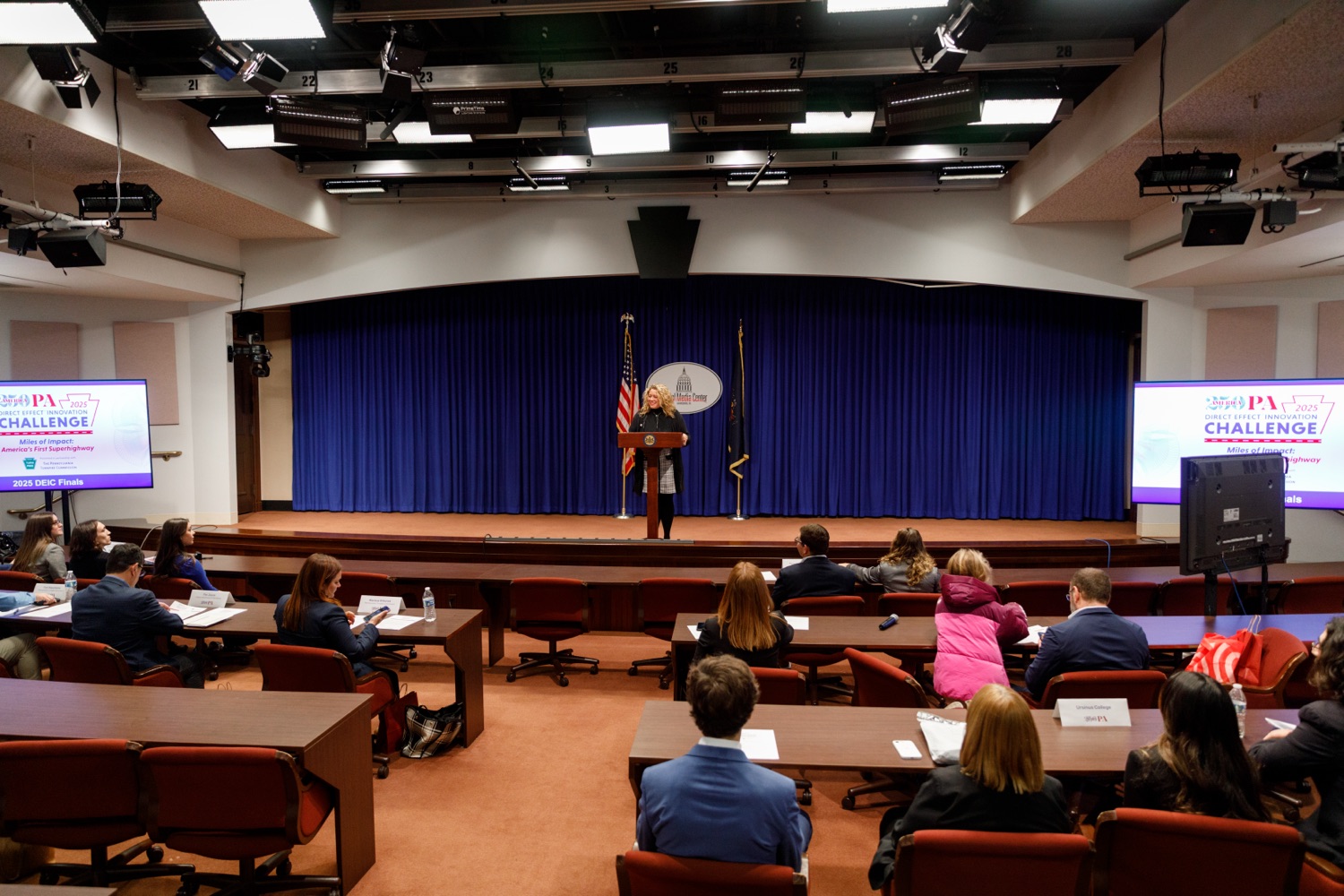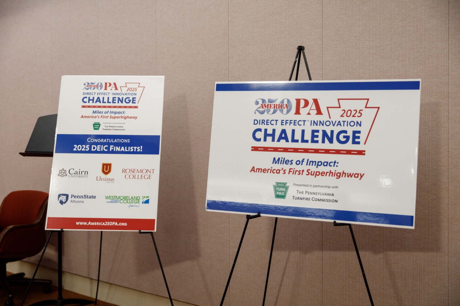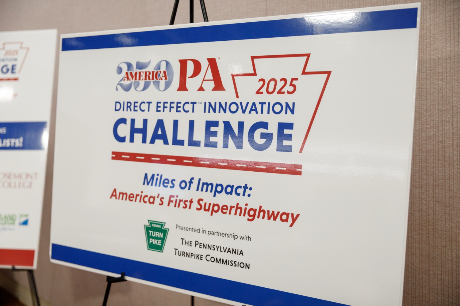 America250PA announces Ursinus College as the winner of its seventh annual 2025 Direct Effect™ Innovation Challenge (DEIC), a multi-round competition that challenges students from postsecondary institutions across the Commonwealth to design and develop integrated marketing campaigns that explore solutions to real-life challenges and questions. Ursinus College competed against four other postsecondary institutions-Rosemont College, Westmoreland County Community College, Penn State Altoona and Cairn University-and received the highest score from a judging panel of industry professionals.The 2025 DEIC consisted of three rounds: a campus round, a virtual second round, and today's in-person final round at the Pennsylvania State Capitol Complex in Harrisburg, PA. This year's theme-"Miles of Impact: America's First Superhighway"-challenged students to design and pitch original integrated marketing campaigns that bring the Pennsylvania Turnpike's story to life - showcasing its historic impact, highlighting its role in shaping mobility and commerce, and inspiring the next generation of travelers to see the PA Turnpike as a journey of innovation and connection.Today's event featured remarks from Cassandra Coleman, America250PA Executive Director; Bri Farrand, America250PA Director of Branding & Design and former DEIC participant; Sheri Herbst, Chief Administrative Officer, Pennsylvania Turnpike Commission; and Michael Coran, Attorney at Klehr Harrison Harvey Branzburg LLP and America250PA Commissioner and Education Subcommittee Chair."The Direct Effect™ Innovation Challenge reflects the promise of Pennsylvania's next generation-their talent, teamwork, and pride in this Commonwealth," said Cassandra Coleman, Executive Director of America250PA. "Working with the Pennsylvania Turnpike Commission gives them the chance to develop creative solutions that shape Pennsylvania's future."